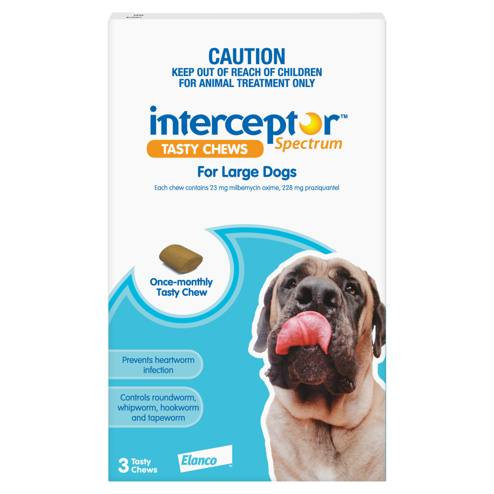 Interceptor Spectrum Chews for Dogs are used monthly for the prevention of heartworm (Dirofilaria immitis) infection, control of adult roundworm (Toxocara canis, Toxascaris leonina), immature roundworm (Toxocara canis), adult whipworm (Trichuris vulpis), adult hookworm (Ancylostoma caninum), adult tapeworm (Echinococcus granulosus, Taenia pisiformis and Dipylidium caninum) and aid in the control of adult hookworm (Uncinaria stenocephala) infection in dogs.